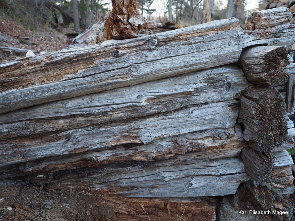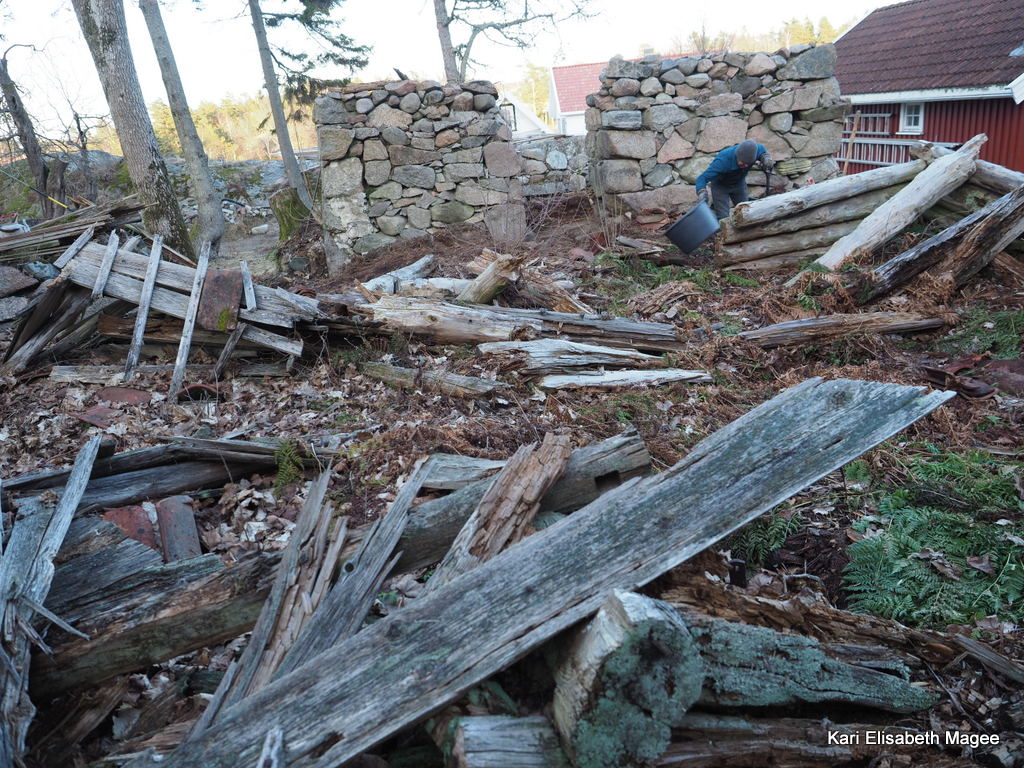 Dersom man beregner ca 10 stokker pr lass har han kjørt 15 lass til sammen. Hvert lass bruker han 2-3 timer på. I tillegg skal hver stokk barkes. Alle stokkene barkes for hånd og de gjenstående kvistene på stokkene tas med øks. Beregn ca. 2-3 timer pr stokk og ja, det er litt av en jobb han har gjort og som han skal gjøre ferdig. Det er denne egeninnsatsen som bidrar til at Fortidsminneforeningen og Kulturminneforeningen lar oss ta del av deres pengesekker.